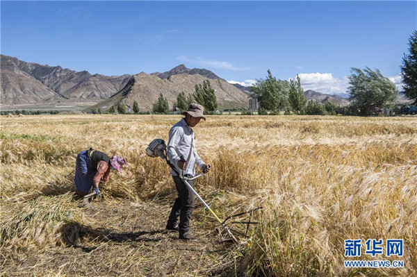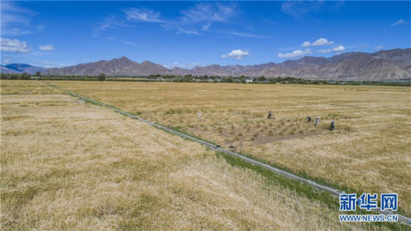 8月29日,農(nóng)民在日喀則市江孜縣的青稞田里忙收割。日喀則是西藏重要的商品糧基地,被譽為“西藏糧倉”。當(dāng)前正值青稞收獲季節(jié),當(dāng)?shù)剞r(nóng)民抓緊收割,農(nóng)田里一片繁忙景象。新華社記者孫非攝