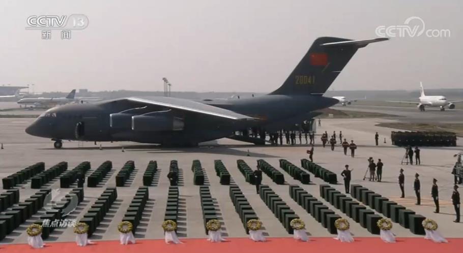 27日11點(diǎn)18分, 載有117位在韓志愿軍烈士遺骸的中國(guó)空軍運(yùn)-20專機(jī)降落在沈陽(yáng)桃仙國(guó)際機(jī)場(chǎng)。機(jī)場(chǎng)用 “過(guò)水門”迎接祖國(guó)的英雄兒女回家,這是航空界最高級(jí)別禮儀。兩架中國(guó)空軍殲11—B戰(zhàn)機(jī)低空拉煙通場(chǎng),向英雄致敬。