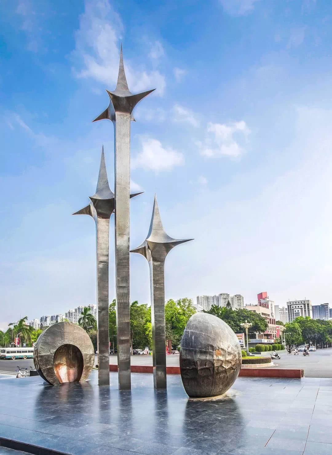 △汕頭的標(biāo)志性雕塑《升騰》,三根頂部鑲有星星標(biāo)志的金屬桿錯落有致,高聳挺拔,寓意汕頭發(fā)展日日上升。(資料圖)