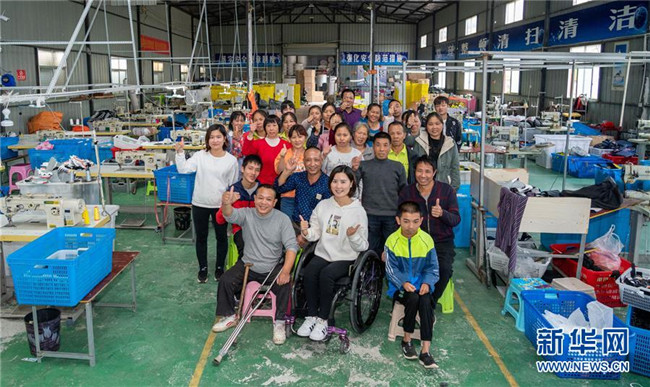 10月13日,在湖南省邵陽市城步縣湖南七七科技股份有限公司生產(chǎn)車間,殘疾女青年楊淑亭(前排中)與工友合影。1991年出生的苗族姑娘楊淑亭因車禍胸部以下高位截癱,通過不斷學(xué)習(xí)摸索,開辦網(wǎng)店并注冊了自己的企業(yè),與周邊貧困家庭簽訂合作協(xié)議,制作售賣具有民族特色的背包和仿真花卉,帶動上千名貧困人員及59名殘疾人就業(yè)。