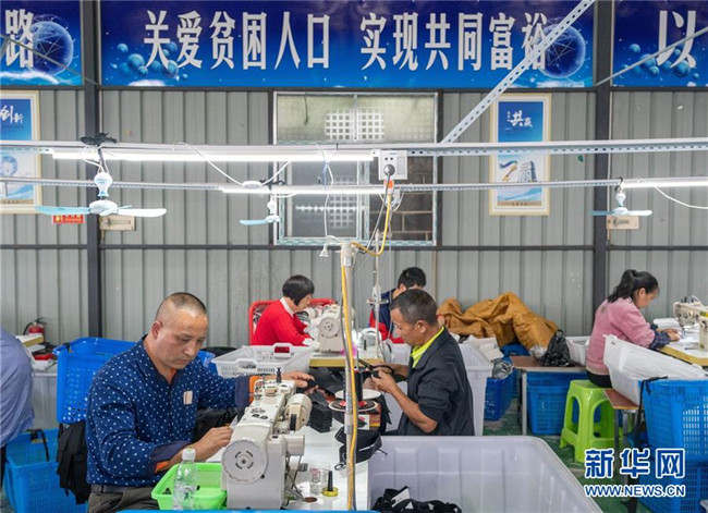 10月13日,在湖南省邵陽市城步縣殘疾人楊淑亭開辦的湖南七七科技股份有限公司生產(chǎn)車間里,工人們在制作民族特色背包。1991年出生的苗族姑娘楊淑亭因車禍胸部以下高位截癱,通過不斷學(xué)習(xí)摸索,開辦網(wǎng)店并注冊了自己的企業(yè),與周邊貧困家庭簽訂合作協(xié)議,制作售賣具有民族特色的背包和仿真花卉,帶動上千名貧困人員及59名殘疾人就業(yè)。