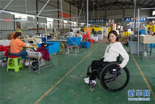 10月13日,殘疾女青年楊淑亭在湖南省邵陽市城步縣自己開辦的湖南七七科技股份有限公司生產(chǎn)車間里。1991年出生的苗族姑娘楊淑亭因車禍胸部以下高位截癱,通過不斷學(xué)習(xí)摸索,開辦網(wǎng)店并注冊了自己的企業(yè),與周邊貧困家庭簽訂合作協(xié)議,制作售賣具有民族特色的背包和仿真花卉,帶動上千名貧困人員及59名殘疾人就業(yè)。