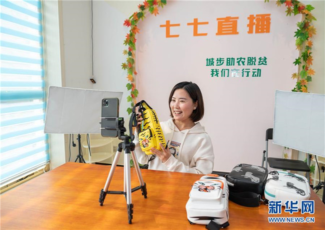 10月13日,在湖南省邵陽市城步縣湖南七七科技股份有限公司,殘疾女青年楊淑亭通過網(wǎng)絡(luò)銷售背包。1991年出生的苗族姑娘楊淑亭因車禍胸部以下高位截癱,通過不斷學(xué)習(xí)摸索,開辦網(wǎng)店并注冊了自己的企業(yè),與周邊貧困家庭簽訂合作協(xié)議,制作售賣具有民族特色的背包和仿真花卉,帶動上千名貧困人員及59名殘疾人就業(yè)。