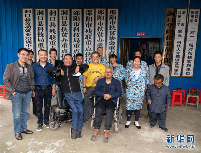 10月13日,在湖南省邵陽市洞口縣華屹化妝品有限公司,殘疾人張赫倫(左五)與他的伙伴們合影留念。42歲的張赫倫在1998年因強(qiáng)直性脊柱炎致一級殘疾,失去生活自理能力。他通過生產(chǎn)洗發(fā)水致富,主動吸納18名殘疾人就業(yè),還以“基地+農(nóng)戶”模式帶動50多戶貧困戶脫貧致富。