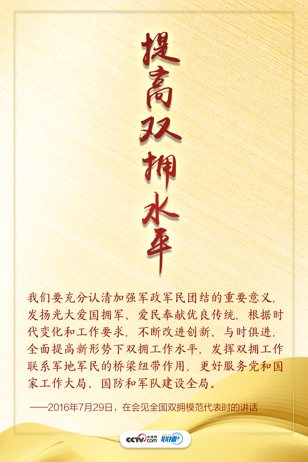習(xí)近平總書記始終高度重視雙擁工作,多次在重要會(huì)議、國(guó)內(nèi)考察時(shí)親力親為指導(dǎo)推動(dòng)。他強(qiáng)調(diào)擁軍優(yōu)屬、擁政愛民是我黨我軍特有的政治優(yōu)勢(shì),堅(jiān)如磐石的軍政軍民關(guān)系是我們戰(zhàn)勝一切艱難險(xiǎn)阻、不斷從勝利走向勝利的重要法寶。