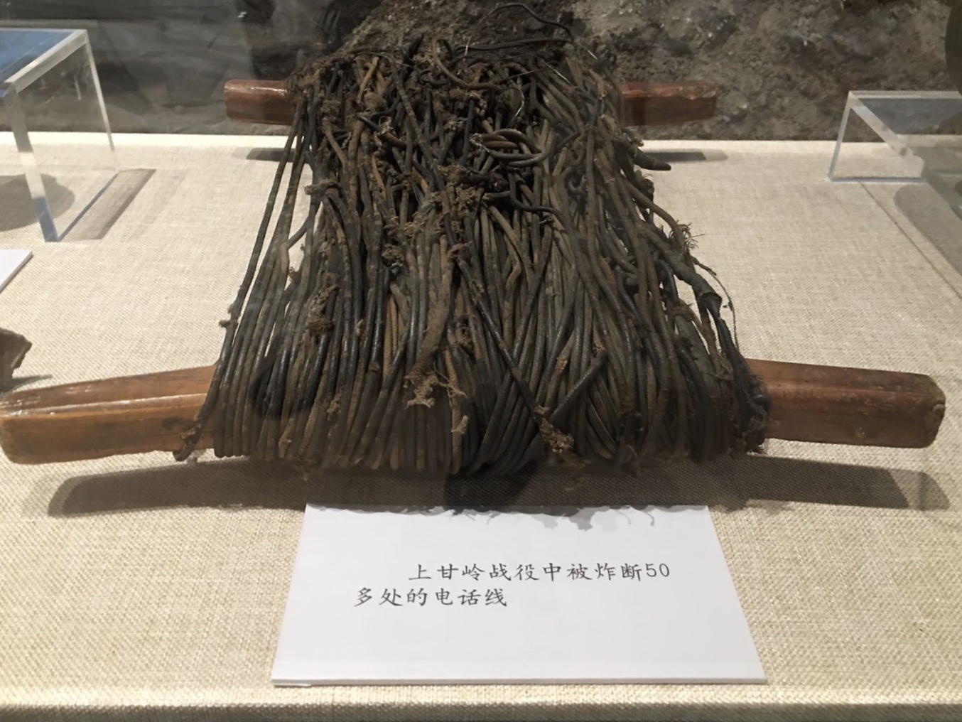在軍博的主題展覽“血戰(zhàn)上甘嶺”展區(qū),幾件戰(zhàn)場實物似乎還能讓人聞到當(dāng)年的殘酷硝煙:一截嵌滿彈片的枯樹干,一堆摻雜著彈片的碎石焦土,被炸斷50多處的200多米電話線……