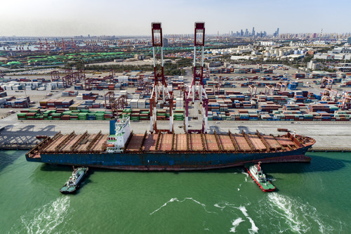 10月27日,一艘貨輪停靠天津港。天津港集團正式開通運營今年第四條“一帶一路”新航線(無人機照片)。新華社發(fā)
