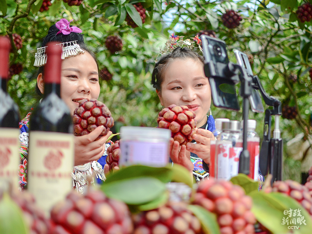 △貴州錦屏縣電商直播帶貨現(xiàn)場。這是當(dāng)?shù)靥厣缯Z叫“布福娜”。