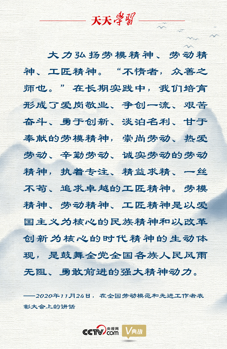 在講話中,習近平總書記還用“不惰者,眾善之師也”這句古語,深刻詮釋勞模精神、勞動精神、工匠精神的實質,指出勞模精神、勞動精神、工匠精神是以愛國主義為核心的民族精神和以改革創(chuàng)新為核心的時代精神的生動體現(xiàn),是鼓舞全黨全國各族人民風雨無阻、勇敢前進的強大精神動力。
