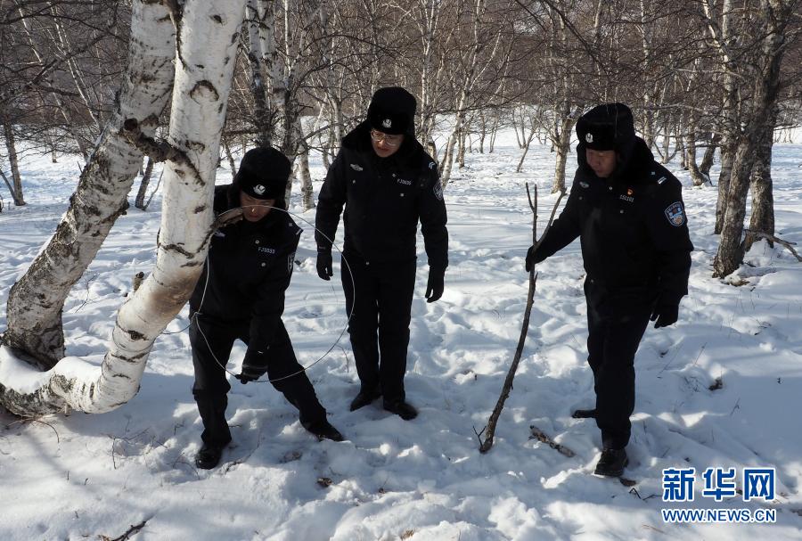11月27日,克什克騰旗森林公安民警在黃崗梁國家森林公園內(nèi),解除盜獵分子下的鋼絲套,消除野生動物安全隱患。新華社發(fā)(王志國 攝)