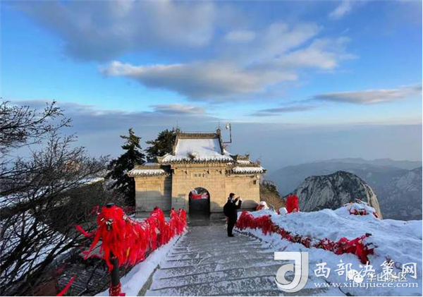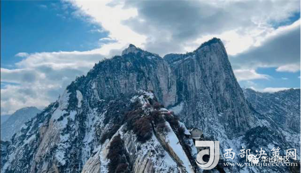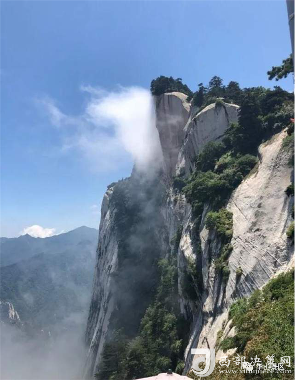 整個(gè)西峰為一塊渾然天成的巨石,北面臨空,懸崖絕壁如刀削鋸截,東西兩側(cè)狀如蓮花,因此也稱“蓮花峰”,這里更是“劈山救母”、“寶蓮燈”等傳說故事的發(fā)生地。