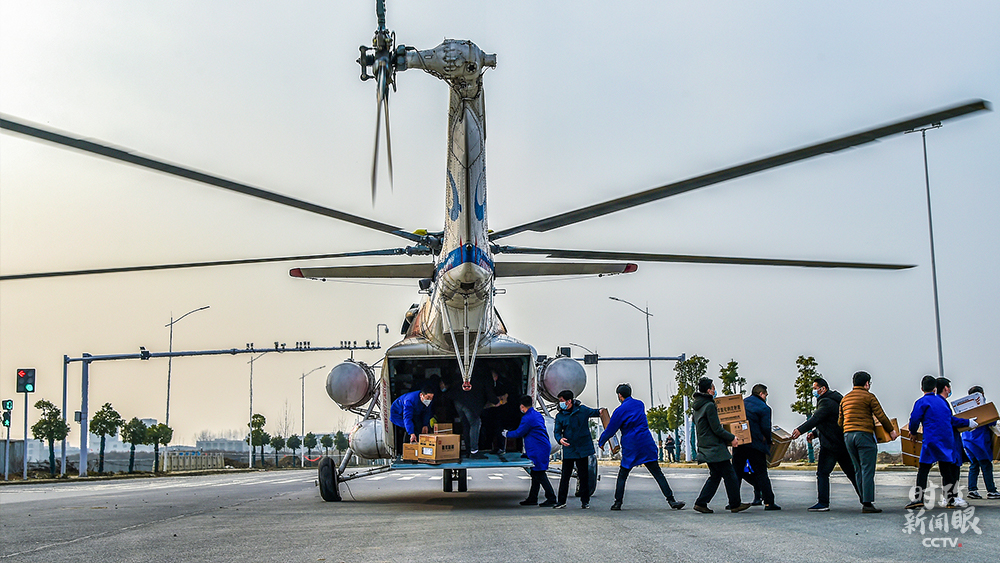 △2月3日,湖北襄陽工作人員正在從直升機上卸下防疫物資。
