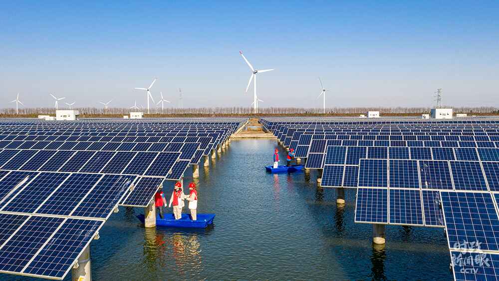 △江蘇海安,電力作業(yè)人員正在巡檢光伏發(fā)電設(shè)施。