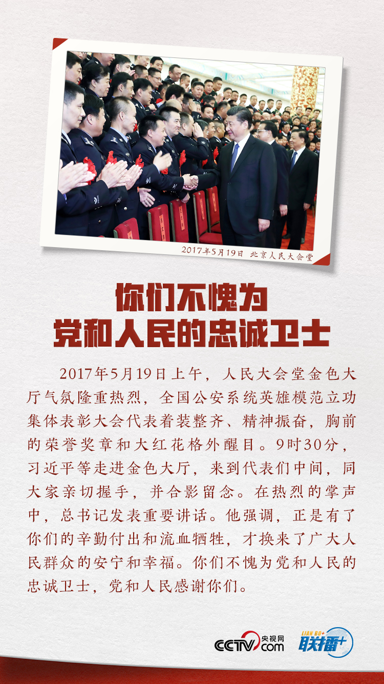 一直以來,習近平總書記對政法工作、對人民警察隊伍高度重視。黨的十八大以來,總書記多次會見全國公安系統(tǒng)的英模代表,多次到基層看望慰問人民警察,在不同場合多次表達對這支隊伍的關心關愛。央視網(wǎng)《聯(lián)播+》欄目特選取六幅珍貴畫面,結合總書記相關重要講話,為您展示人民領袖對人民警察的深情厚望。