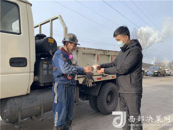 寒風(fēng)阻擋不住一心為職工送溫暖的熱情,該支部黨員志愿者冒著嚴寒,為地面室外下料職工送上了一雙雙厚實保暖的手套、暖心的奶茶,囑咐他們注意保暖,預(yù)防感冒,特殊天氣更要提高防護意識,確保安全生產(chǎn)。