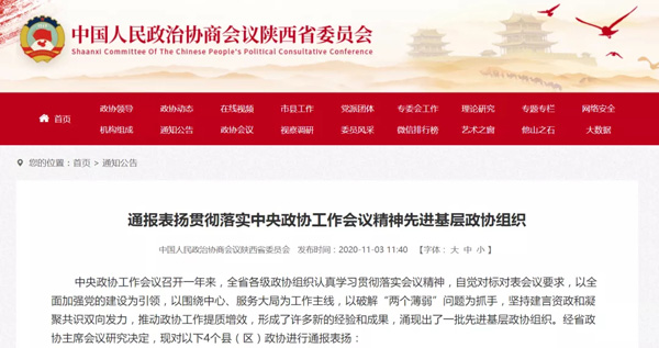 中央政協(xié)工作會議召開一年多來,陜西全省各級政協(xié)組織認真貫徹落實會議精神,堅持建言資政和凝聚共識雙向發(fā)力,推動政協(xié)工作提質增效,形成了許多新的經(jīng)驗和成果,涌現(xiàn)出了一批先進基層政協(xié)組織。2020年11月2日,省政協(xié)十二屆四十七次主席會議決定通報表揚貫徹落實中央政協(xié)工作會議精神先進基層政協(xié)組織,金臺區(qū)政協(xié)、富平縣政協(xié)、富縣政協(xié)和柞水縣政協(xié)4家縣(區(qū))政協(xié)組織榜上有名。