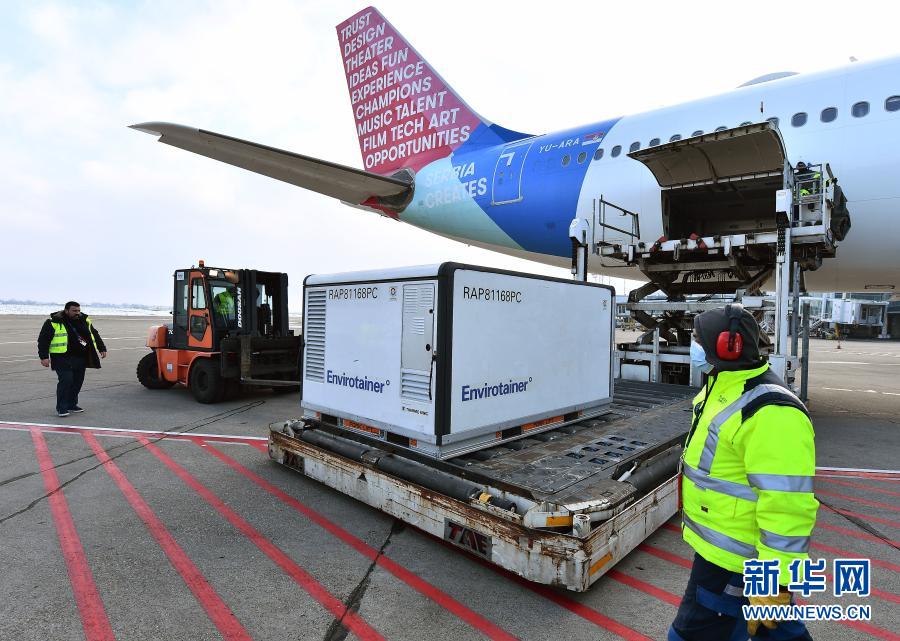2021年1月16日,在塞爾維亞首都貝爾格萊德,機(jī)場工作人員卸載首批由中國國藥集團(tuán)生產(chǎn)的新冠疫苗。新華社發(fā)(普雷德拉格·米洛薩夫列維奇攝)