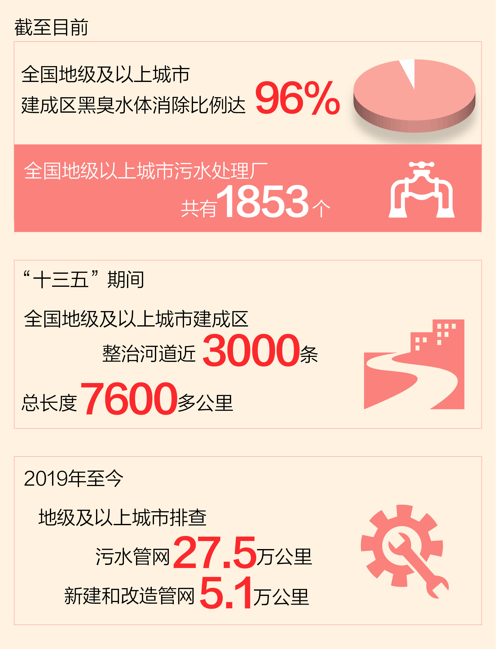 “十三五”期間,全國(guó)地級(jí)及以上城市建成區(qū)整治河道近3000條,總長(zhǎng)度7600多公里。截至目前,全國(guó)地級(jí)及以上城市建成區(qū)黑臭水體消除比例達(dá)96%。2019年至今,全國(guó)地級(jí)及以上城市排查污水管網(wǎng)27.5萬(wàn)公里,新建和改造管網(wǎng)5.1萬(wàn)公里。