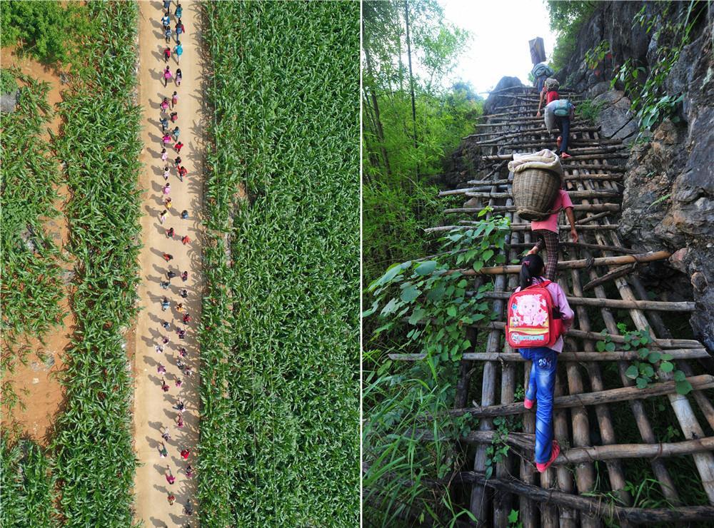 拼版照片:左圖為在廣西大化瑤族自治縣板升鄉(xiāng)弄勇村,孩子們走在放學(xué)路上(2019年5月10日攝,無人機(jī)照片);右圖為在弄勇村弄頂屯,孩子們扛著生活用具,爬懸梯回家(2012年7月4日攝)。目前,弄勇村所有的屯都已告別沒有公路的歷史。新華社記者 黃孝邦 攝