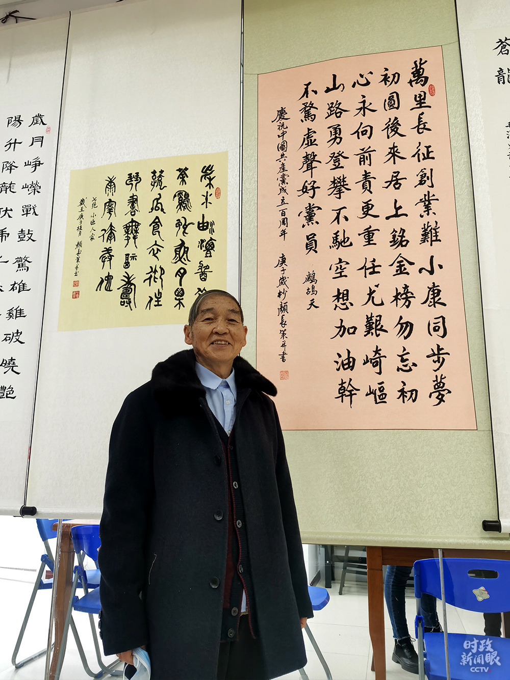 △這是87歲的社區(qū)居民顏長策老先生為慶祝中國共產(chǎn)黨成立100周年創(chuàng)作并書寫的詩作。(總臺央視記者姚瑤拍攝)
