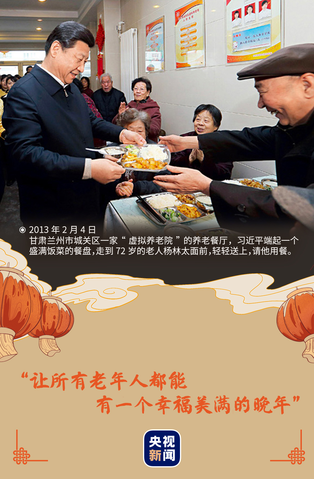 在各地考察中,習(xí)近平一次次走進(jìn)鄉(xiāng)村、社區(qū)、養(yǎng)老機(jī)構(gòu)和養(yǎng)老服務(wù)站,與老人們親切交流,叮囑要給予他們更多關(guān)心。在蘭州“虛擬養(yǎng)老院”的養(yǎng)老餐廳,總書(shū)記親自給老人遞飯菜;在北京四季青敬老院,總書(shū)記觀看老人作畫(huà)、手工制作、排練合唱等,祝福他們健康長(zhǎng)壽……
