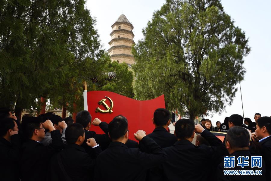 游客在陜西延安寶塔山上重溫入黨誓詞(2019年4月25日攝)。新華社記者 劉瀟 攝