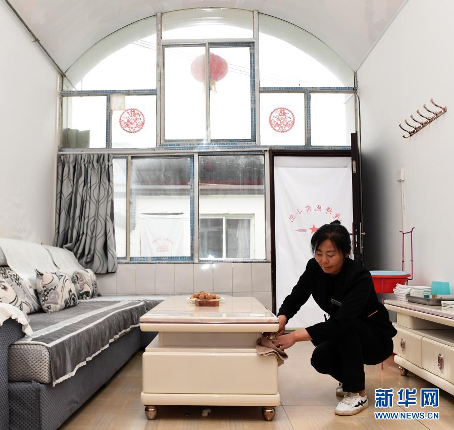 陜西延安寶塔區(qū)馮莊鄉(xiāng)康坪村的一個窯洞民宿里,員工在打掃房間(2019年5月6日攝)。新華社記者 劉瀟 攝