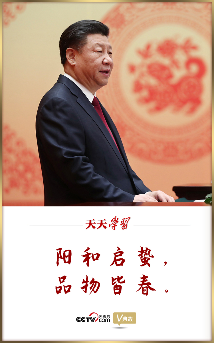 2018年,祖國大地春來早,立春剛過,春節(jié)將臨。在春節(jié)團拜會上,習近平總書記在講話開場即引用“陽和啟蟄,品物皆春”這一名句,描繪了祖國大地春風拂面、萬象更新的景象。