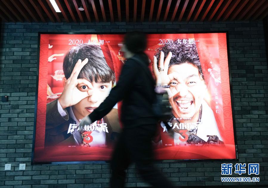 2月17日,在北京前門的保利國際影城,觀眾從《唐人街探案3》海報前走過。新華社記者 陳鐘昊 攝