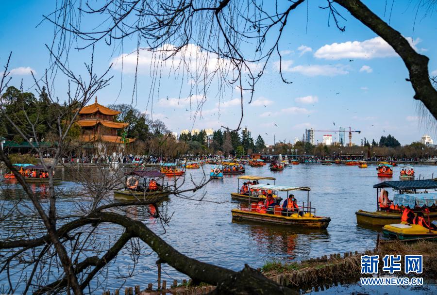 2月16日,游客在云南省昆明市大觀公園里劃船。新華社記者 陳欣波 攝