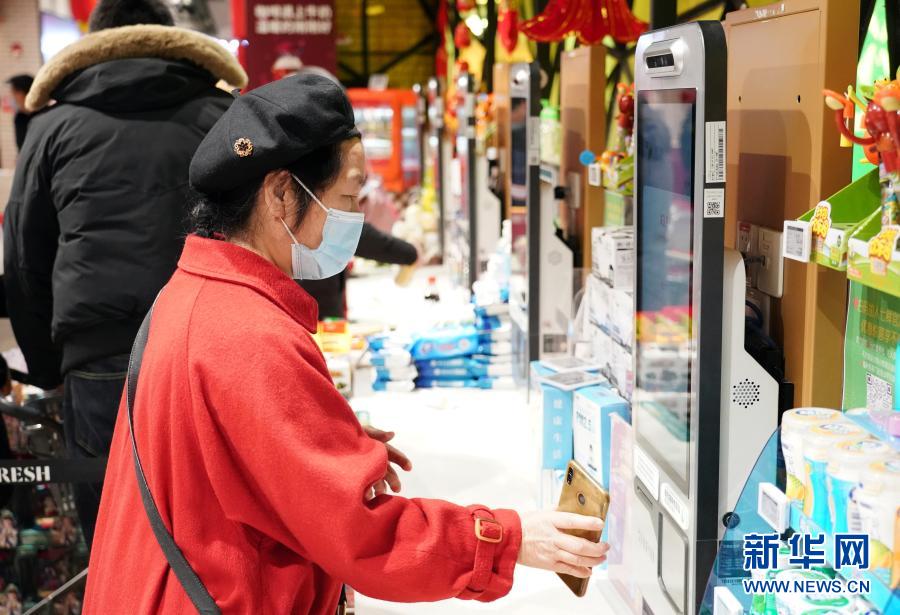 2月15日,在北京市海淀區(qū)的七鮮超市北京華宇店,顧客通過自助收銀機結帳。新華社記者 任超 攝