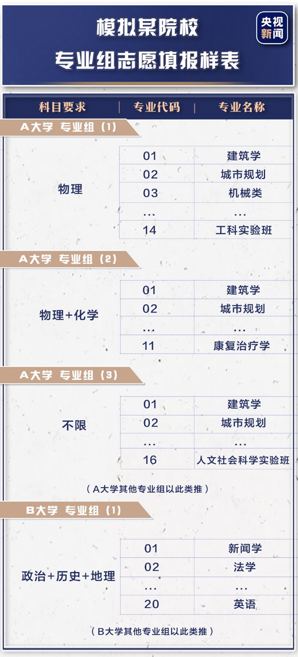 學(xué)生在填報(bào)志愿表時(shí),按照“院校專(zhuān)業(yè)組+專(zhuān)業(yè)”的方式填寫(xiě),只要選考科目符合要求,學(xué)生就可以在志愿表第1行填寫(xiě)A大學(xué)專(zhuān)業(yè)組(1)+該專(zhuān)業(yè)組后面的幾個(gè)專(zhuān)業(yè),第2行填寫(xiě)A大學(xué)專(zhuān)業(yè)組(2)+該專(zhuān)業(yè)組后面的幾個(gè)專(zhuān)業(yè),以此類(lèi)推。