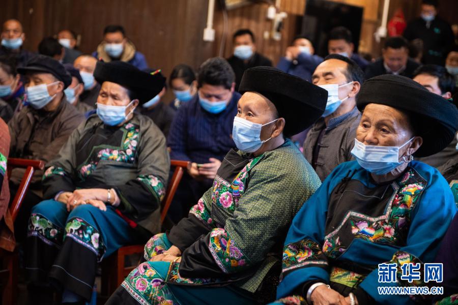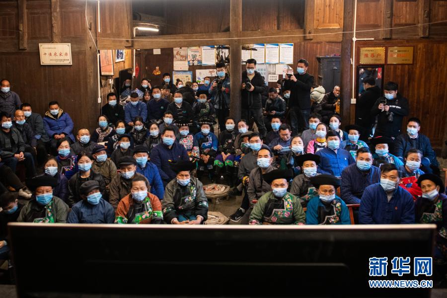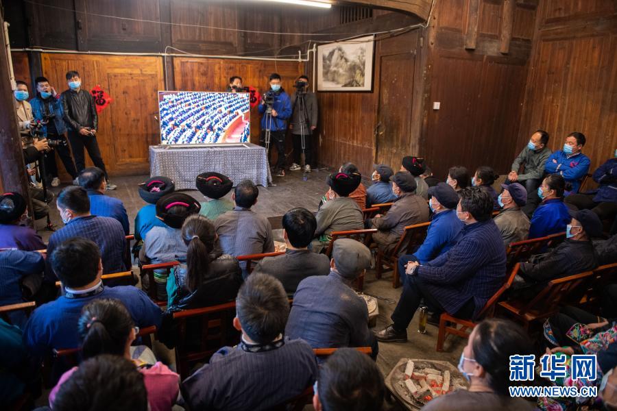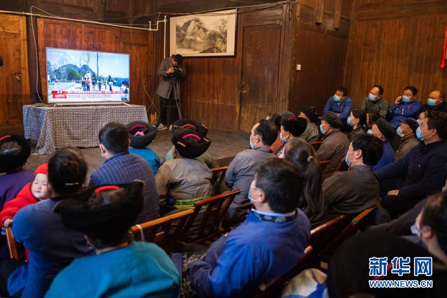 2月25日上午,在湖南省湘西土家族苗族自治州花垣縣十八洞村,當(dāng)?shù)馗刹俊⑷罕娫谝粦舸迕窦沂湛慈珖撠毠钥偨Y(jié)表彰大會直播。新華社記者 陳思汗 攝