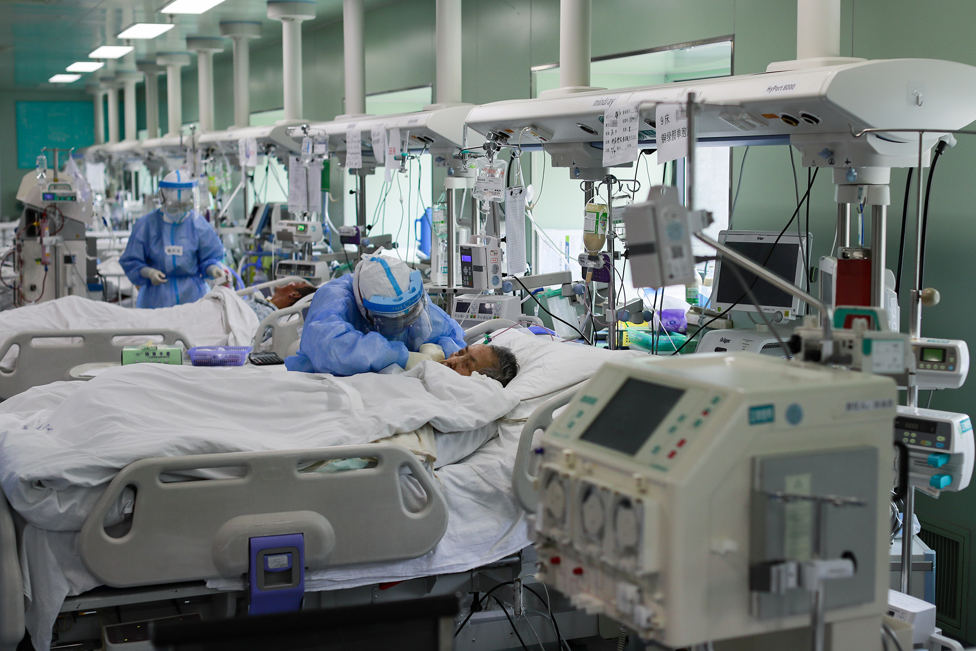 ↑2020年4月24日,在位于武漢的華中科技大學同濟醫(yī)學院附屬協(xié)和醫(yī)院西院,醫(yī)務人員在護理核酸檢測結(jié)果轉(zhuǎn)陰的新冠肺炎病人。