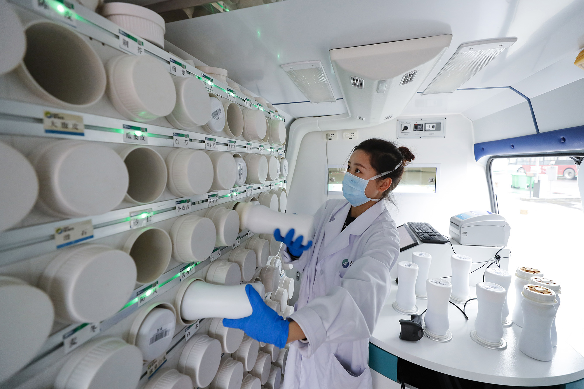 ↑2020年2月26日,在武漢江夏方艙醫(yī)院院內(nèi)的“流動應急智能中藥房”里,系統(tǒng)把藥方中包含的單味藥用綠燈標識出來,工作人員將這些盛有單味中藥濃縮顆粒的藥瓶取下來準備制藥。江夏方艙醫(yī)院是武漢首個以中醫(yī)院運轉(zhuǎn)模式來進行臨床治療、管理的方艙醫(yī)院。