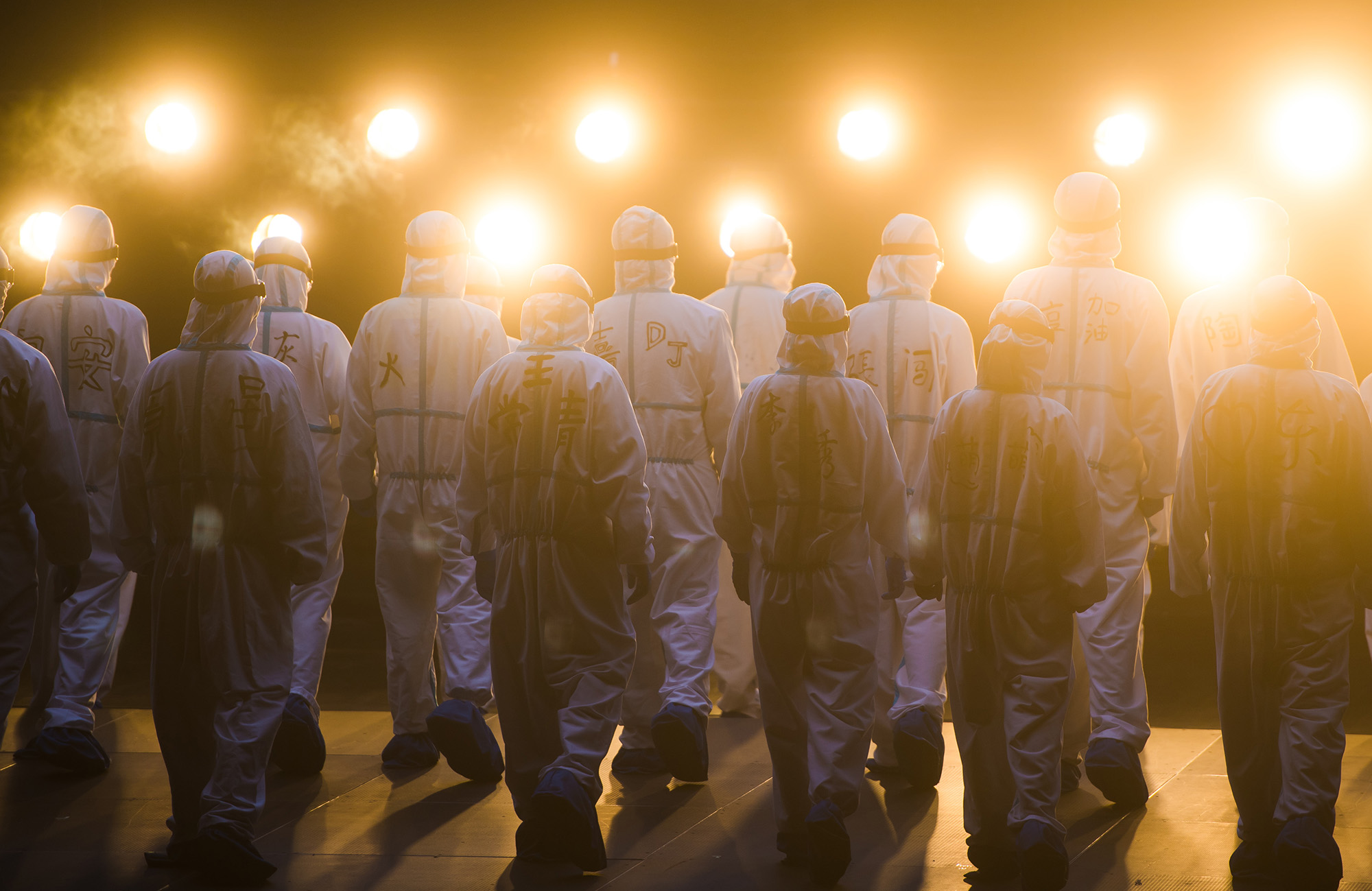 ↑2020年2月12日,醫(yī)務人員在武漢體育中心方艙醫(yī)院前豎起拇指為自己和同伴加油鼓勁。