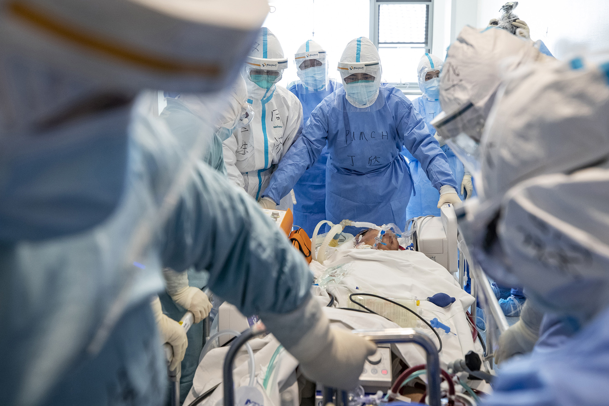 ↑2020年4月12日,北京協(xié)和醫(yī)院醫(yī)療隊隊員與武漢同濟醫(yī)院醫(yī)務人員共同將一名新冠肺炎危重癥患者轉(zhuǎn)往武漢同濟醫(yī)院中法新城院區(qū)ICU。在轉(zhuǎn)運過程中,ECMO(人工膜肺)治療仍在持續(xù)進行。