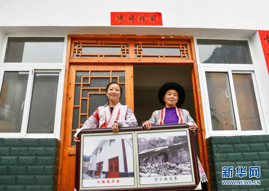 2月20日,在貴州省畢節(jié)市黔西縣新仁苗族鄉(xiāng)化屋村麻窩寨易地扶貧搬遷集中安置點(diǎn),苗族女孩王代玉(左)與母親楊文梅在自家新房前展示易地扶貧搬遷前后的對(duì)比照片。近年來,化屋村在實(shí)施易地扶貧搬遷的同時(shí),大力發(fā)展特色種植、養(yǎng)殖、旅游等產(chǎn)業(yè),村里迎來跨越式發(fā)展。 新華社記者 楊文斌 攝