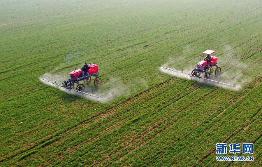 3月5日,河北省邢臺(tái)市南和區(qū)閻里鄉(xiāng)閻里村農(nóng)民操作農(nóng)業(yè)機(jī)械在麥田噴灑農(nóng)藥(無人機(jī)照片)。新華社記者 朱旭東 攝