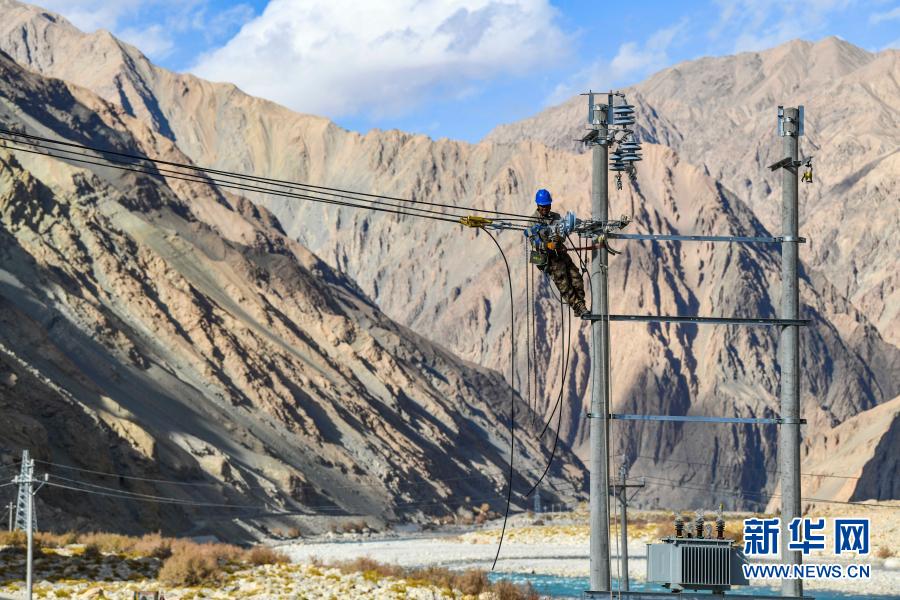 在新疆塔什庫爾干塔吉克自治縣的深山中,工人在調(diào)節(jié)一處入戶線路的松緊度(2019年11月23日攝)。為了解決供電難題,新疆加大投入,實(shí)施光伏供電村電網(wǎng)延伸工程,惠及偏遠(yuǎn)村莊。 新華社記者 胡虎虎 攝