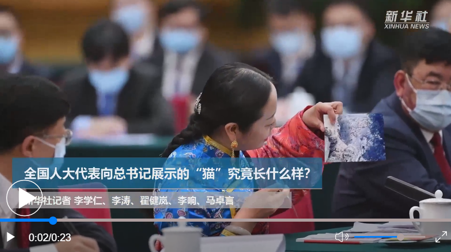 在會(huì)議現(xiàn)場(chǎng),全國(guó)人大代表、青海省海北藏族自治州門源回族自治縣教育局教研室副主任孔慶菊拿出兩張照片,向習(xí)總書記展示了兩種可愛的“貓”。