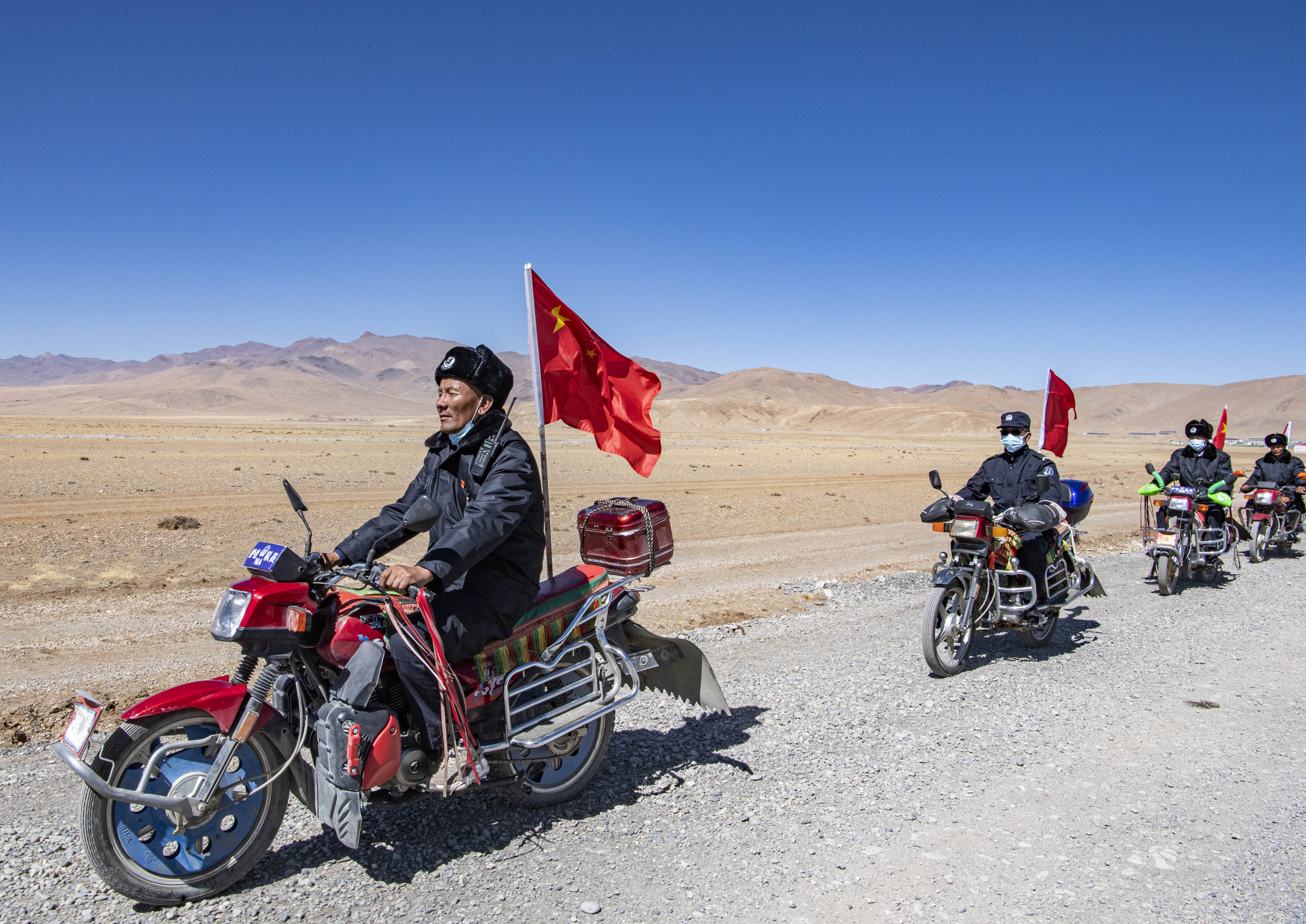 西藏日喀則市薩嘎縣昌果鄉(xiāng)的一處村莊里,48歲的藏族漢子石覺(jué)塔布在風(fēng)中跨上一輛摩托車,向平坦無(wú)垠的高原邊緣騎去。車尾,一面五星紅旗被風(fēng)吹得獵獵作響。