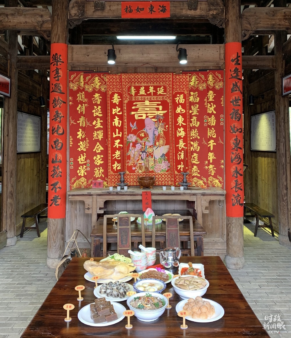 在俞邦村,習(xí)近平考察了夏茂特色小吃民俗文化館。館中最吸引眼球的當(dāng)屬這桌豐盛的壽宴。按照當(dāng)?shù)亓?xí)俗,壽宴當(dāng)天,大公雞、壽餅、壽酒、壽桃、壽面、壽燭、壽炮都是必備之禮。