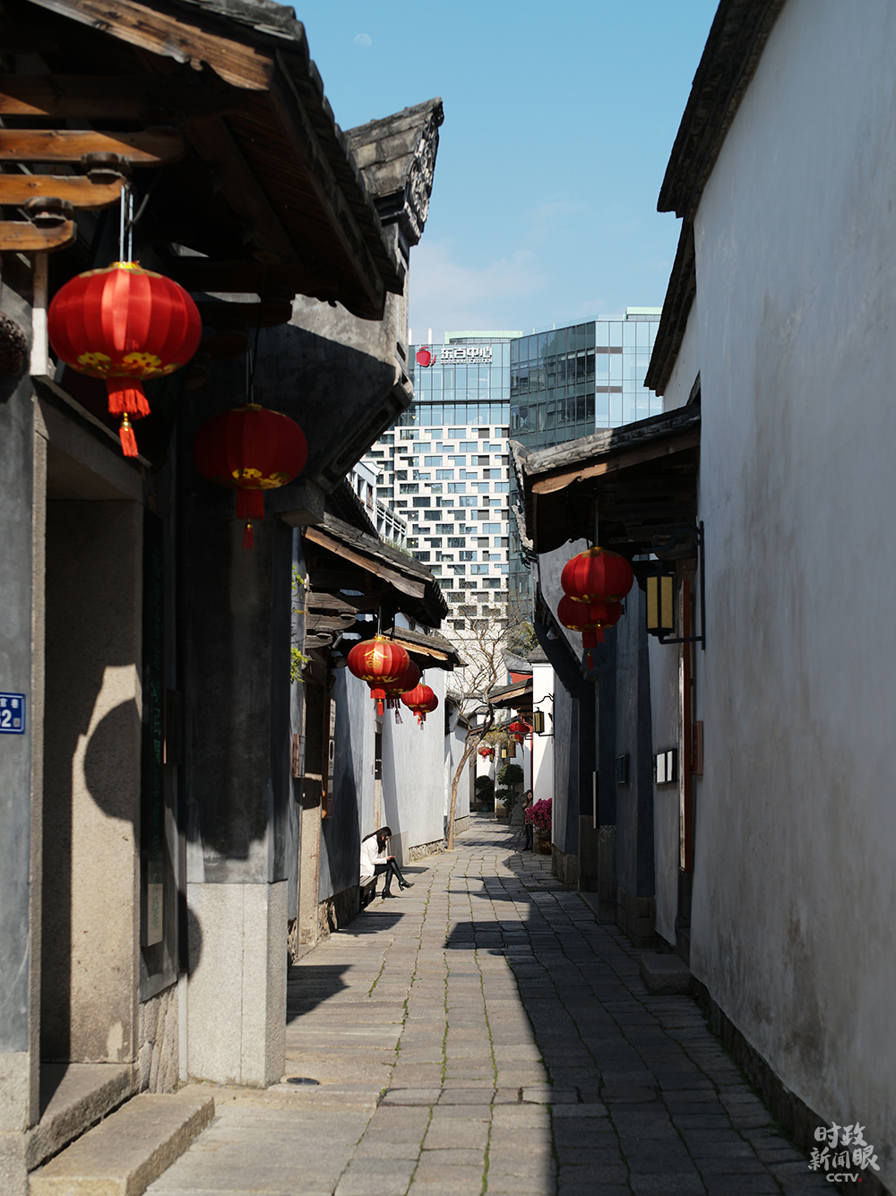△走進郎官巷,可以看到街區(qū)外的高樓,新舊建筑風(fēng)格交相輝映。(總臺央視記者彭漢明拍攝)