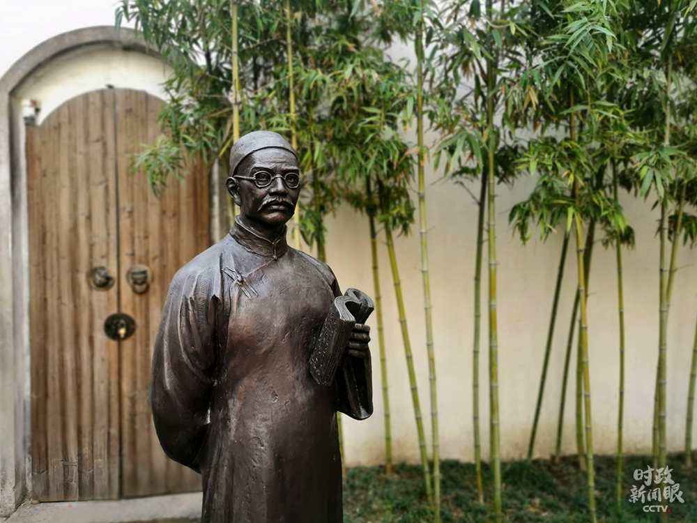 △嚴(yán)復(fù)故居中,嚴(yán)復(fù)雕像手中所拿的是《天演論》。(總臺央視記者張宇、覃思拍攝)