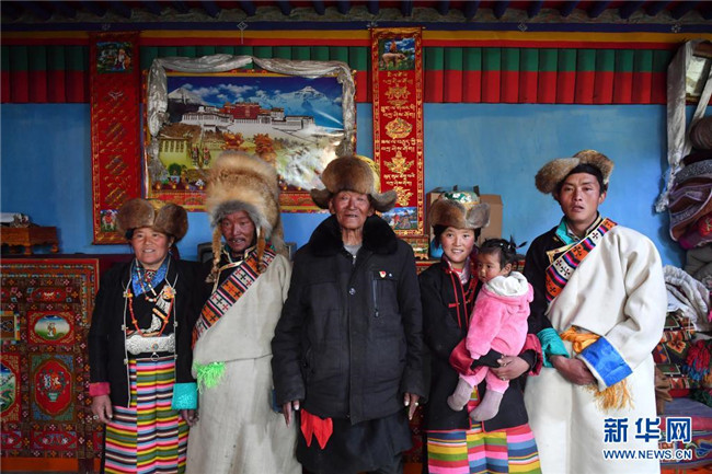 巴桑(左三)和家人合影(3月21日攝)。新華社記者 張汝鋒 攝