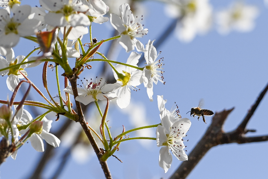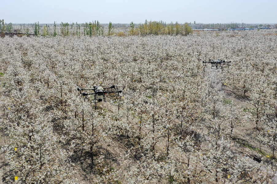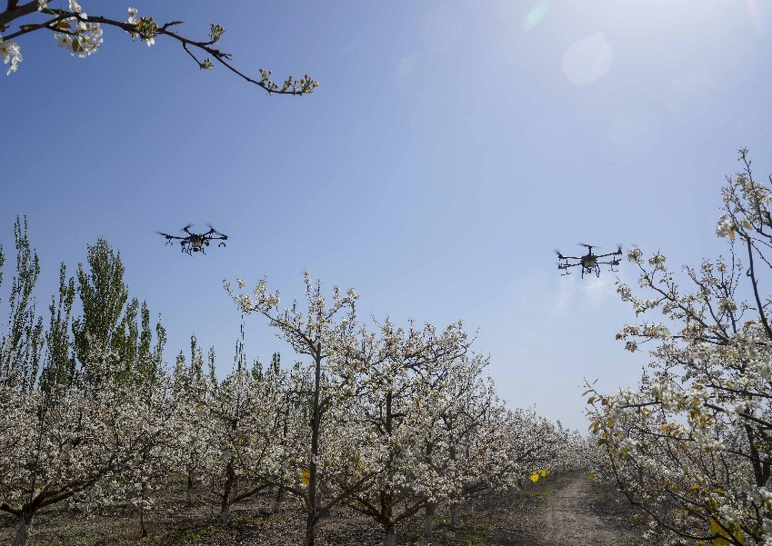 在新疆南疆等地,梨樹花期很短,且往往伴隨沙塵天氣,梨樹授粉作為梨產(chǎn)業(yè)發(fā)展中最為關(guān)鍵的一環(huán),以往通過人工授粉或者蜜蜂授粉進(jìn)行。隨著人工成本不斷增加以及產(chǎn)業(yè)健康發(fā)展需要,以蜜蜂采集的高活性授粉用花粉聯(lián)合無人機(jī)噴施的蜂機(jī)協(xié)同作業(yè)高效液體授粉技術(shù)開始出現(xiàn)。