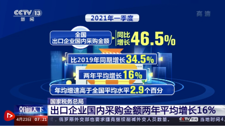 央視網(wǎng)消息:外貿(mào)高質(zhì)量發(fā)展是我國(guó)經(jīng)濟(jì)增長(zhǎng)的重要拉動(dòng)力。國(guó)家稅務(wù)總局相關(guān)負(fù)責(zé)人表示,稅務(wù)部門積極實(shí)施出口退稅便利化措施,一季度全國(guó)出口企業(yè)國(guó)內(nèi)采購(gòu)金額兩年平均增長(zhǎng)16%。