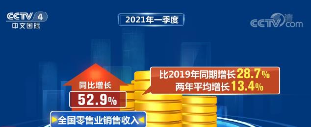 增值稅發(fā)票數(shù)據(jù)顯示,2021年一季度,全國零售業(yè)銷售收入同比增長52.9%,比2019年同期增長28.7%,兩年平均增長13.4%。其中,食品飲料、紡織服裝零售收入同比增長都超過50%,兩年平均增長在15%以上。