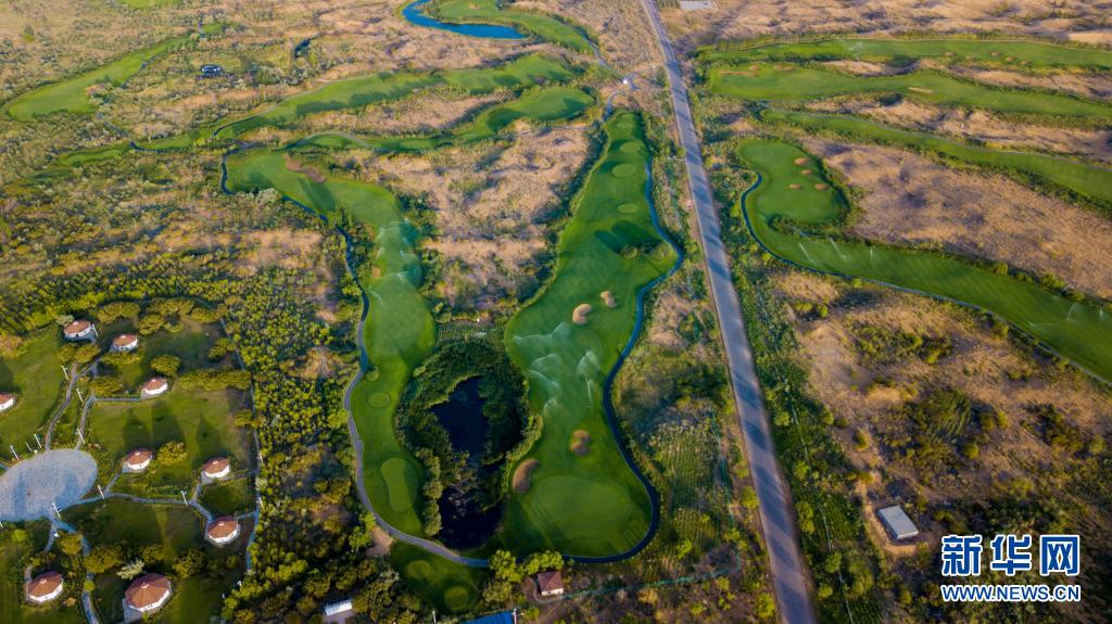 這是位于庫布其沙漠中的七星湖景區(qū)(2018年7月11日攝,無人機(jī)照片)。新華社記者 彭源 攝